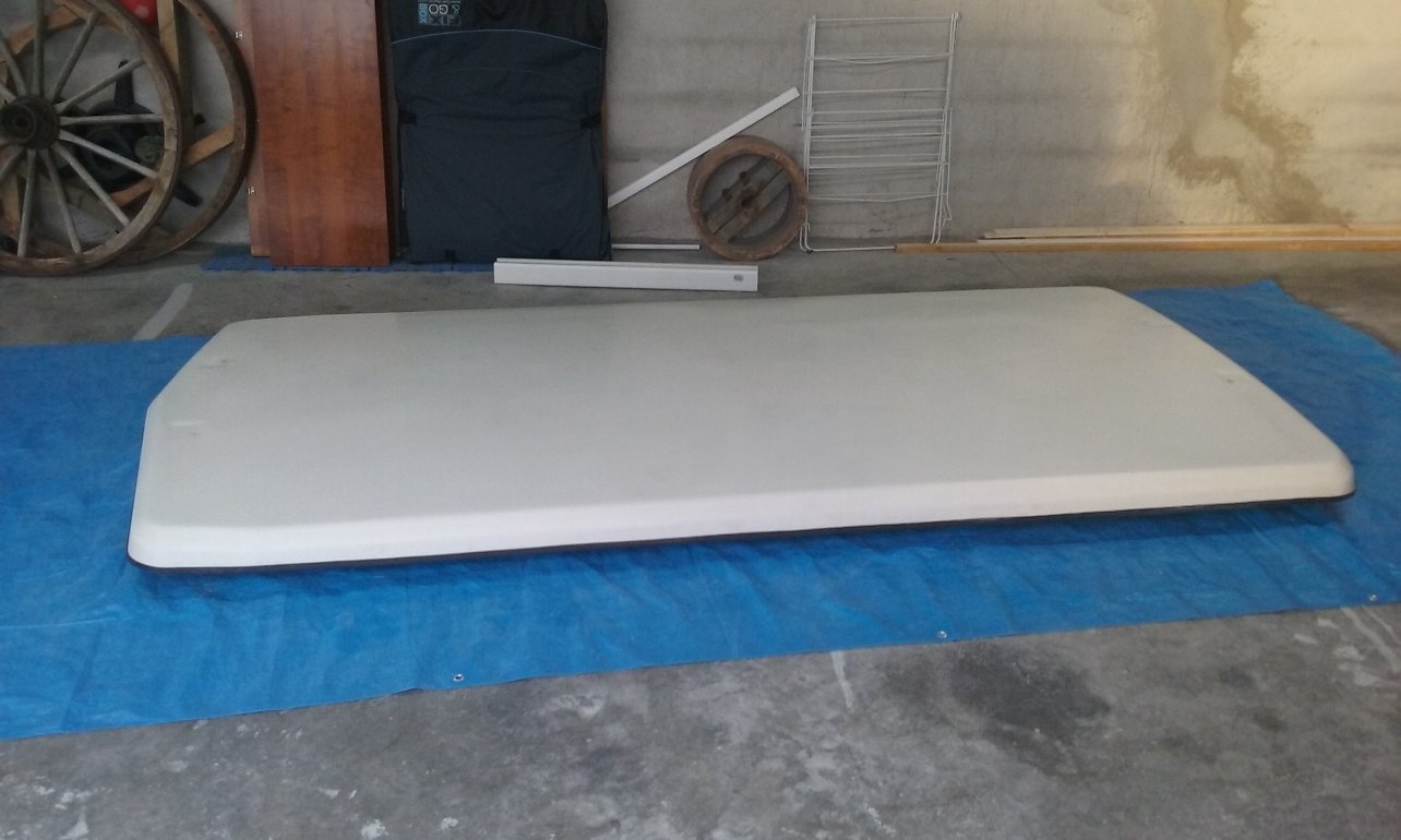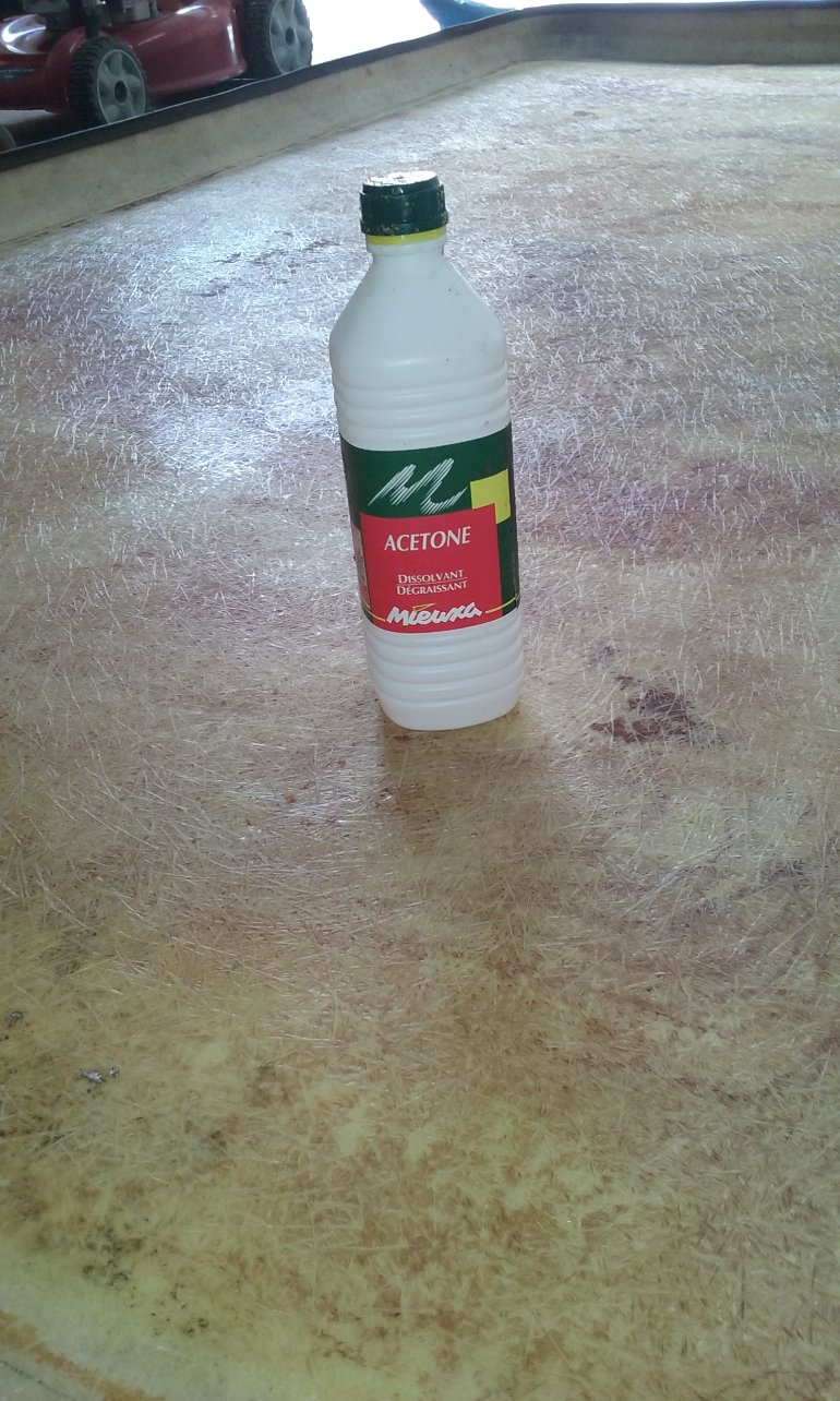 J'ai simplement poncé finement le toit en fibre et rebouché les fissures et les impacts avec le mastic polyester de finition.