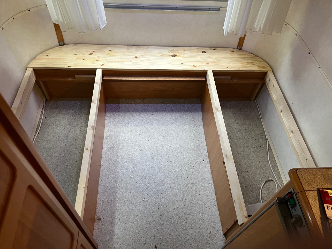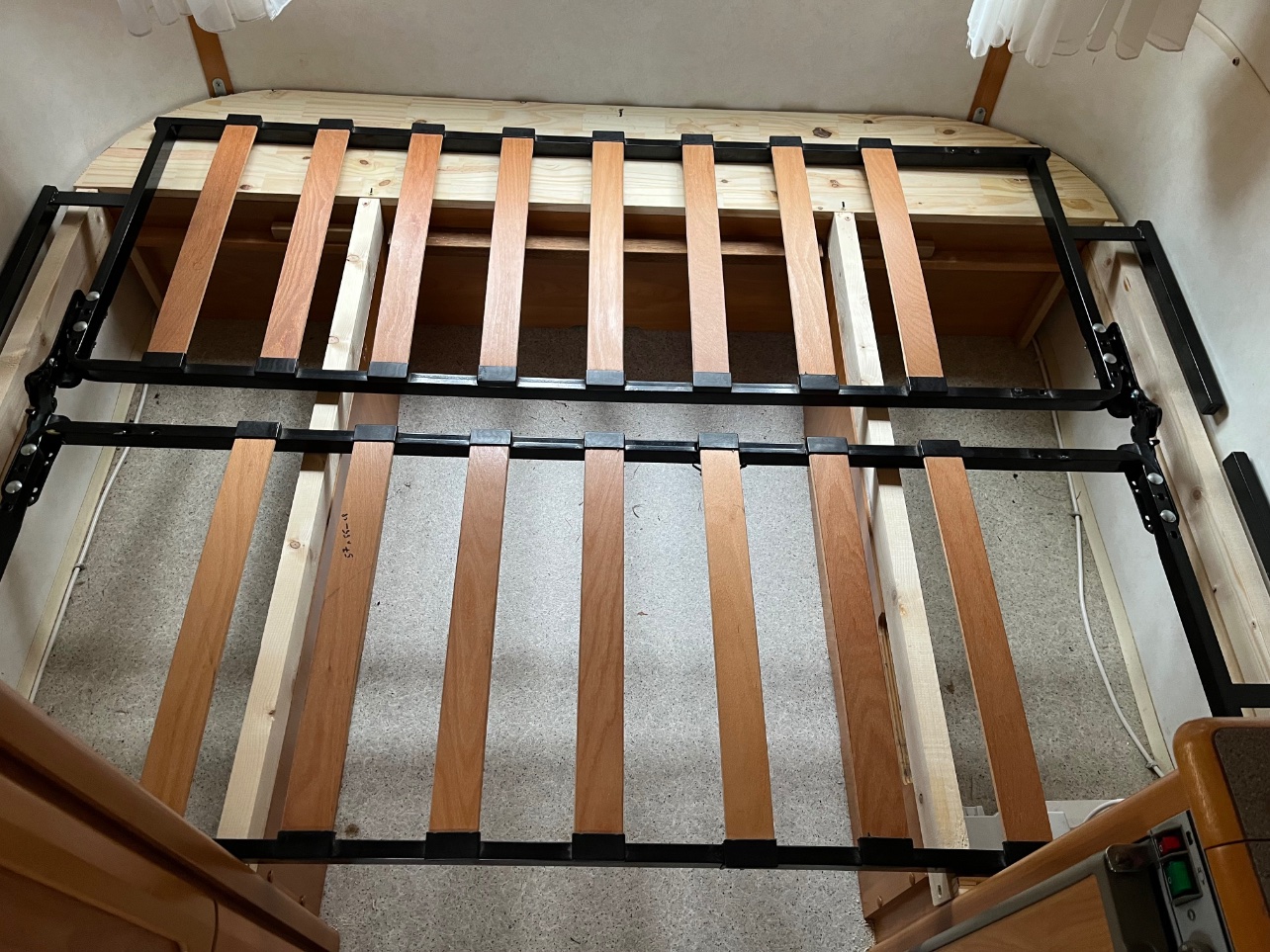 Apres découpe du sommier pour qu'il entre dans l'arrondi de la caravane , suppression du système