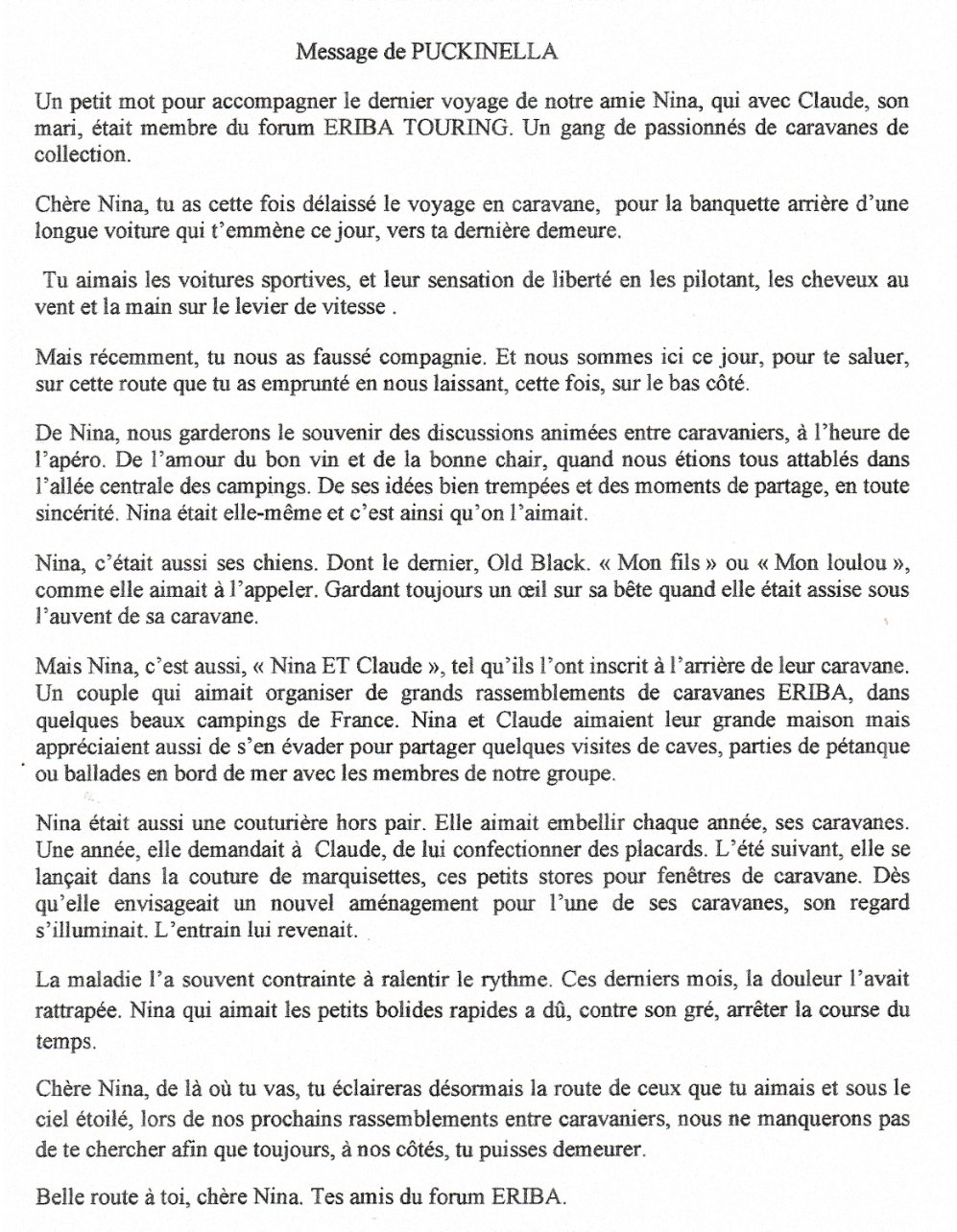 Claude, tu m'as prévenu ce matin, Michelle et moi partageons ta douleur, nous garderons le souvenir de Nina radieuse, le verre à la main à Puyravault et à Pougues les Eaux.