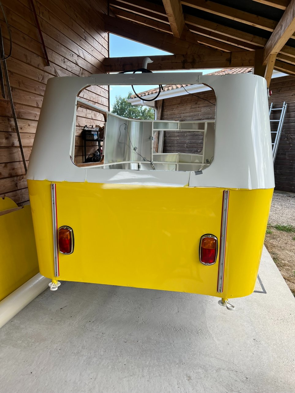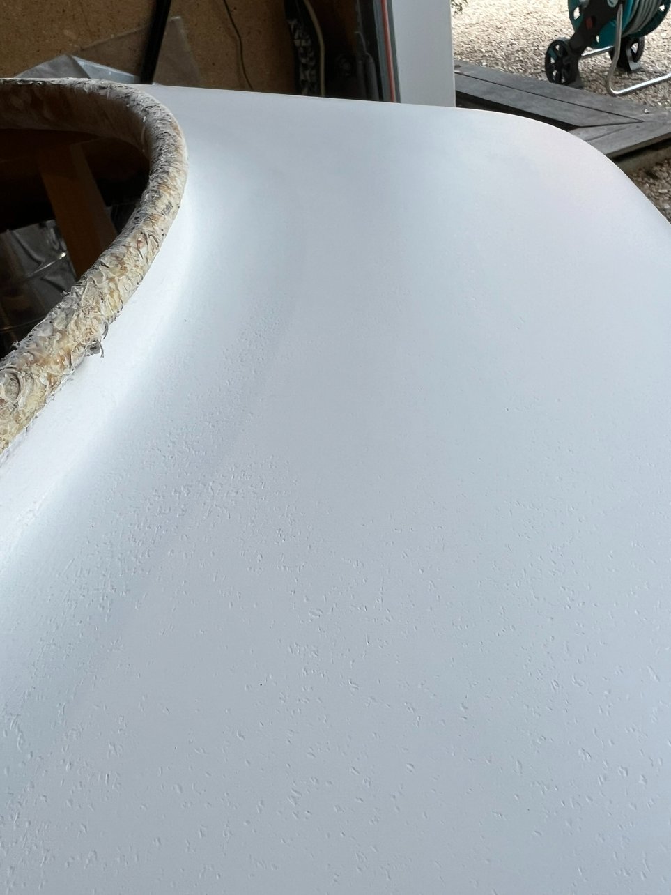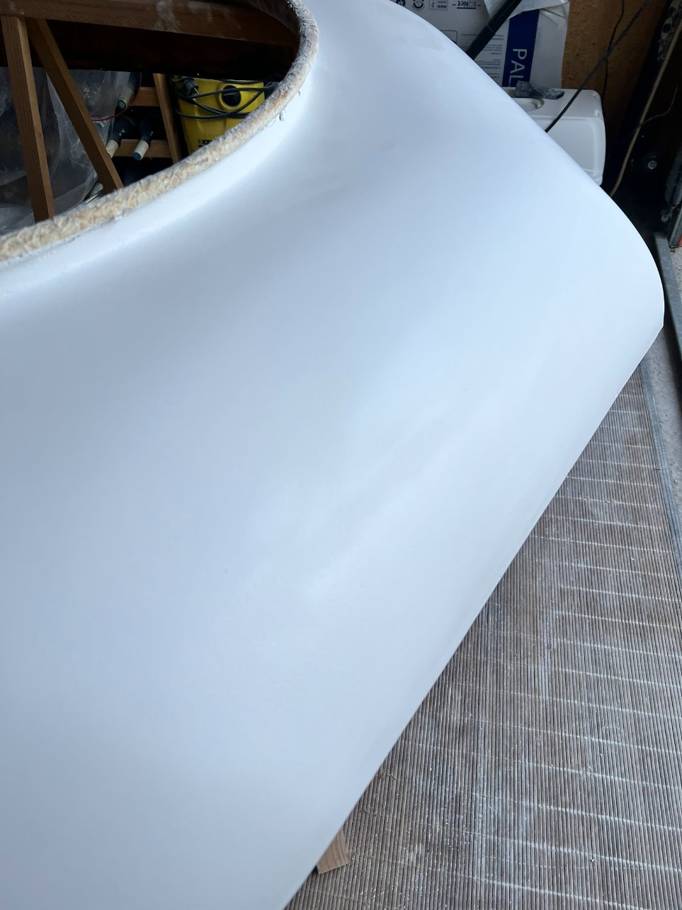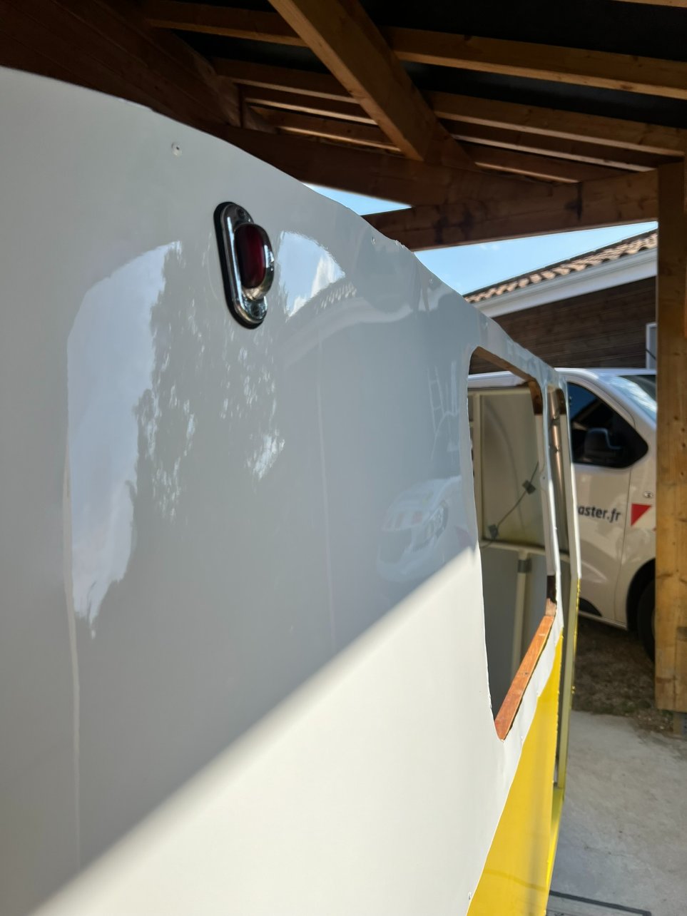 Plus qu'à tester le ponçage au 600 et / ou 800 (j'ai mis du gelcoat sur une planche pour faire des tests) et voir si j'arrive à le rendre lisse et brillant car pour le moment c'est mate et rugueux. Le toit prenant de la place il va falloir que j'accélère mais les vacances sont déjà terminées :pleur4: