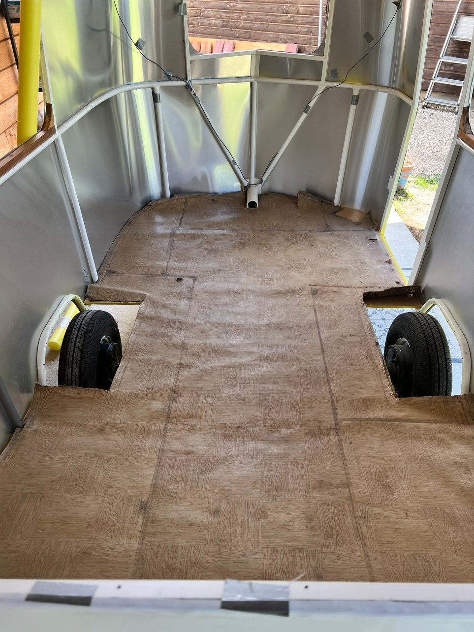 Par chance les trous de vis que j'ai fait sont presque tous bien tombés, le plancher tient bien, il est stable en marchant et dessous le Sika déborde un peu. Et pour finir cet après-midi, pose de l'écope pour le gaz sous le plancher.