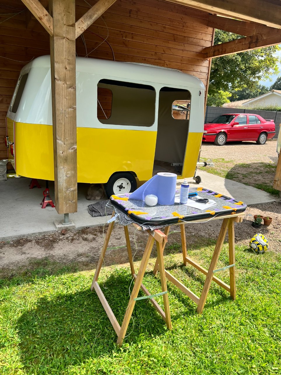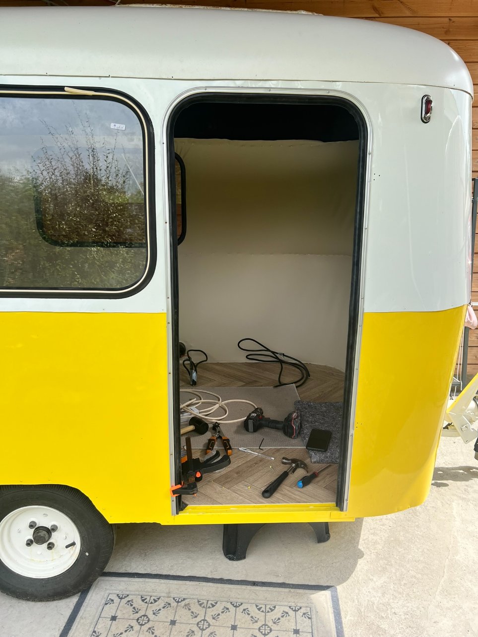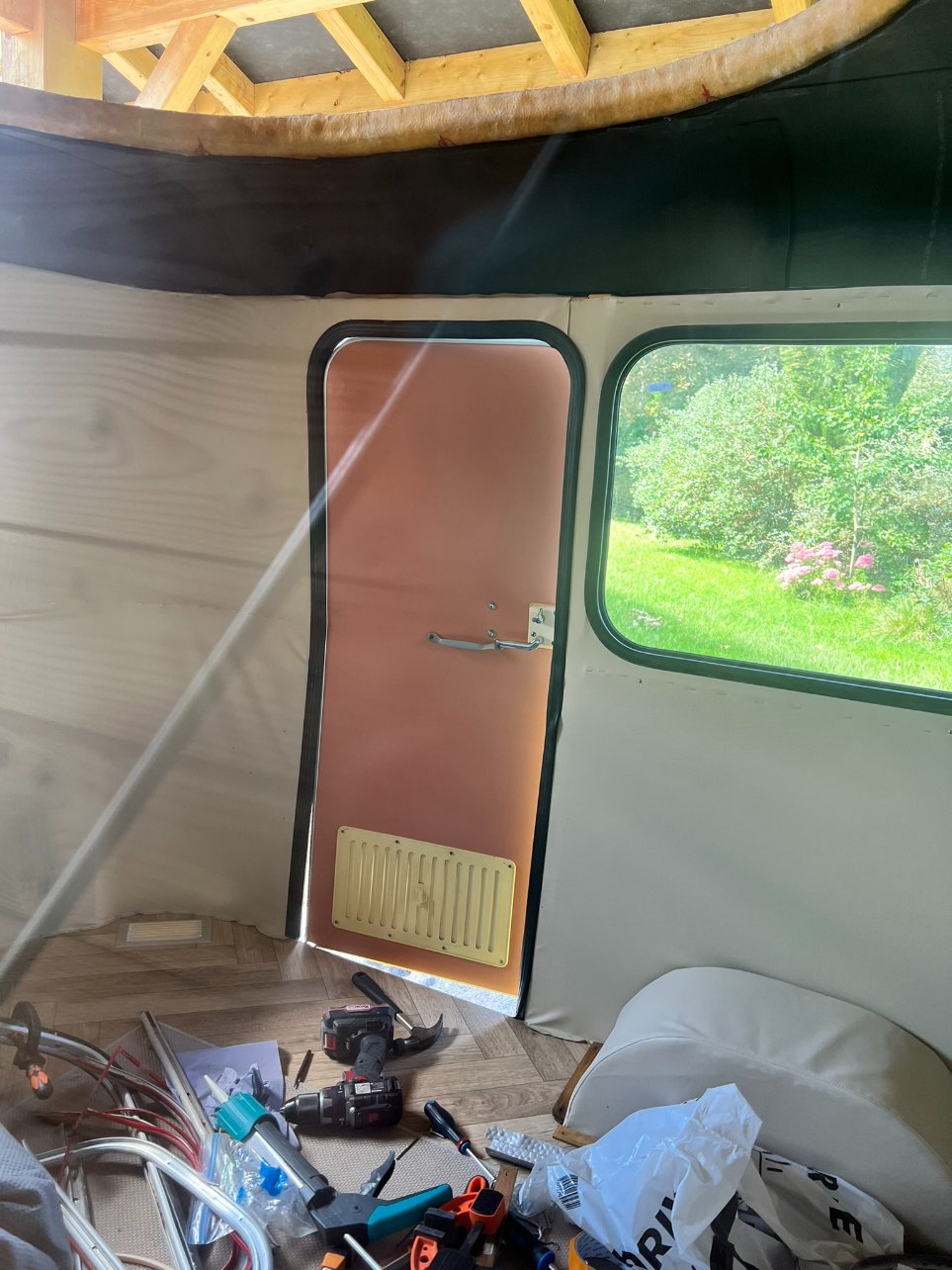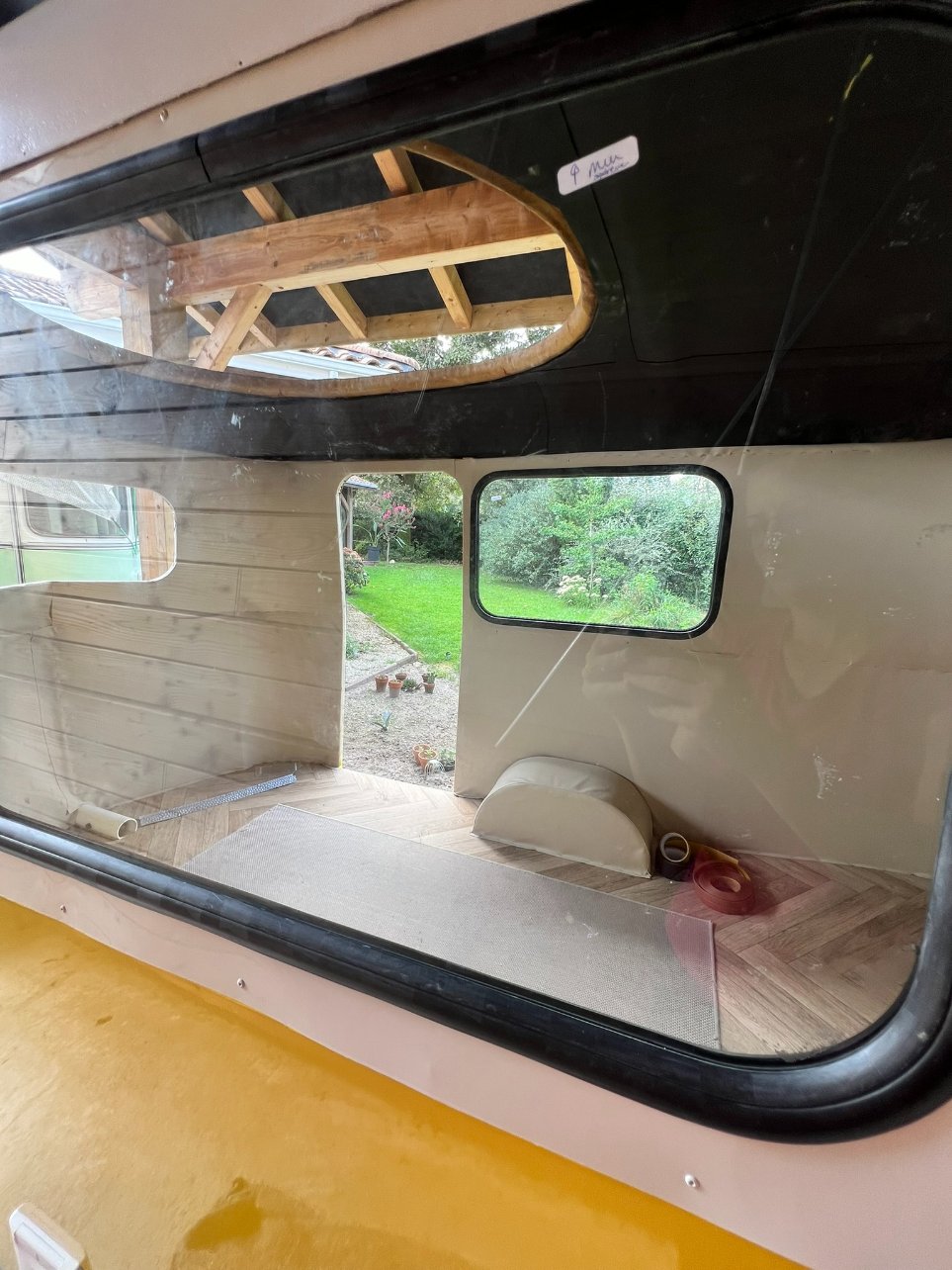 Vu ce qu'il reste à faire, j'ai peur qu'elle ne puisse rouler vendredi même 3 km pour notre rétro camping car pour cela il faut absolument: finir les vitres (sauf peut-être l'arrière), mettre la porte, fixer la rehausse (même si pas fini et la toile pas mise)... je suis femme de challenge mais là... compliqué.