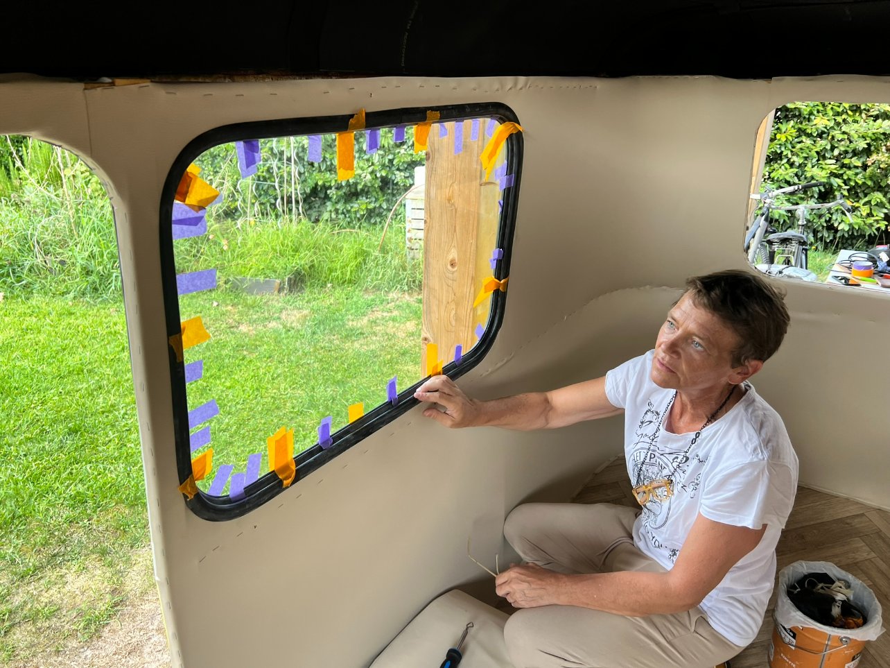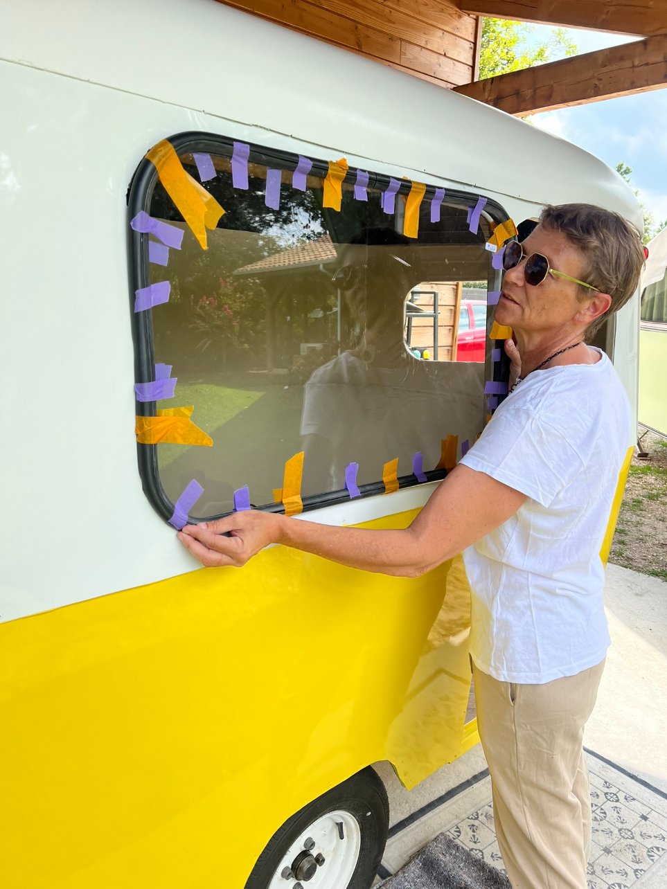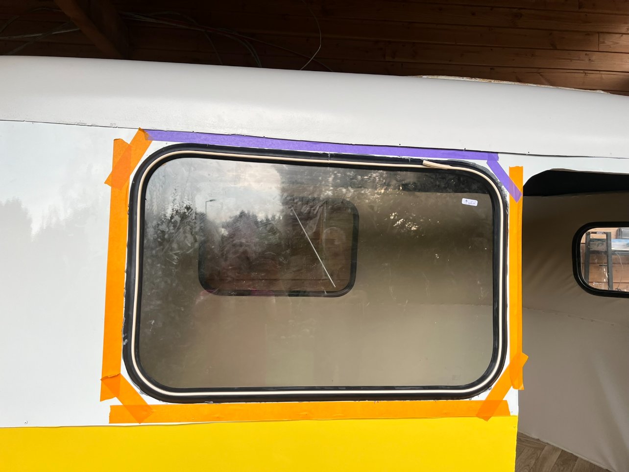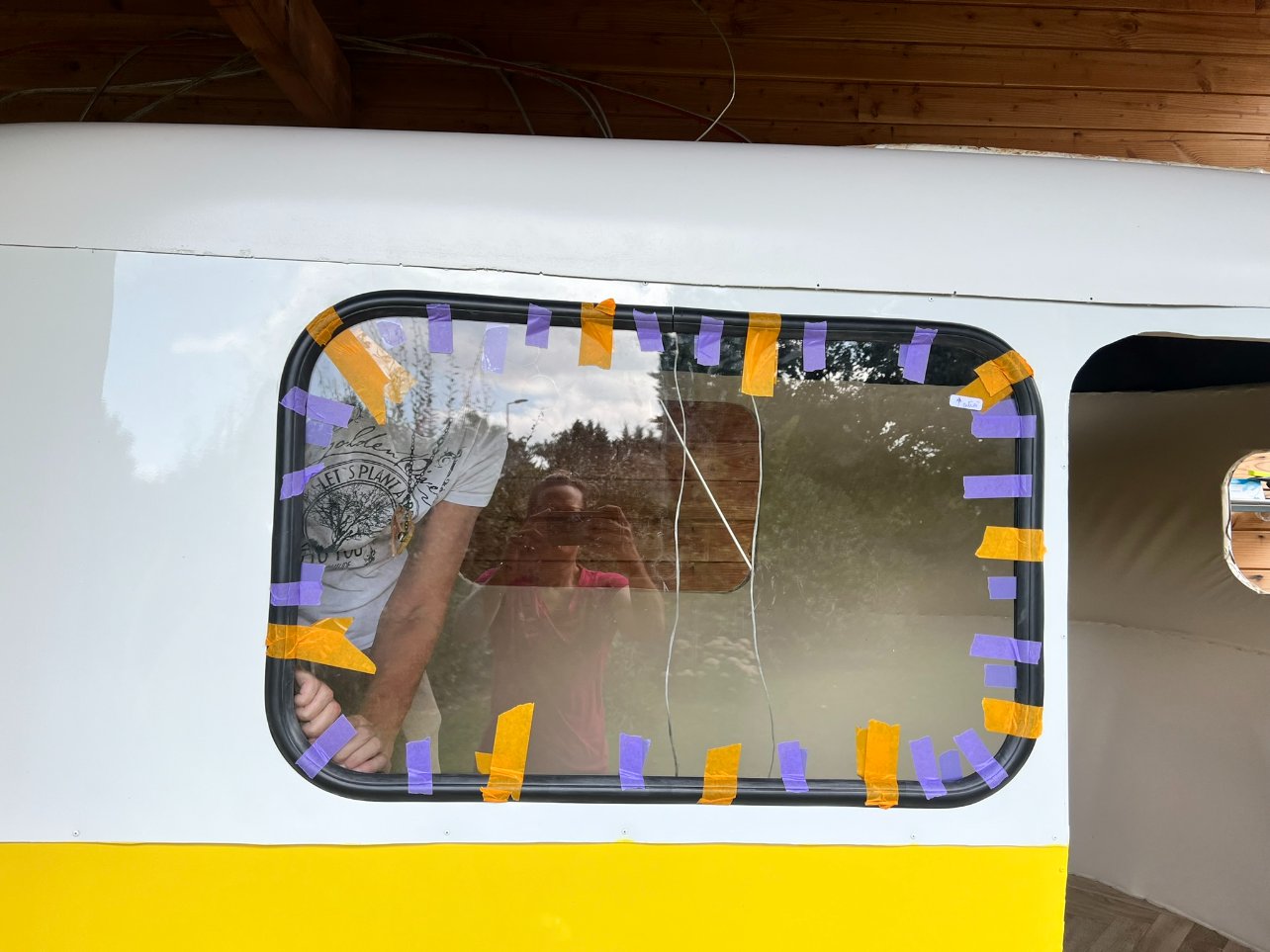 Bon après, il y a eu le petit pétage de plomb avec le butyl, je vais pas revenir dessus, mais il faut mettre pas mal de matière sous le joint et contre la carrosserie. Comme j'ai un côté cracra et même si je sais que le butyl s'enlève très bien le lendemain, j'ai mis du scotch de masquage autour de la fenêtre pour qu'il n'y en ait pas partout, plus pour me rassurer, il n'a pas servi à grand chose...