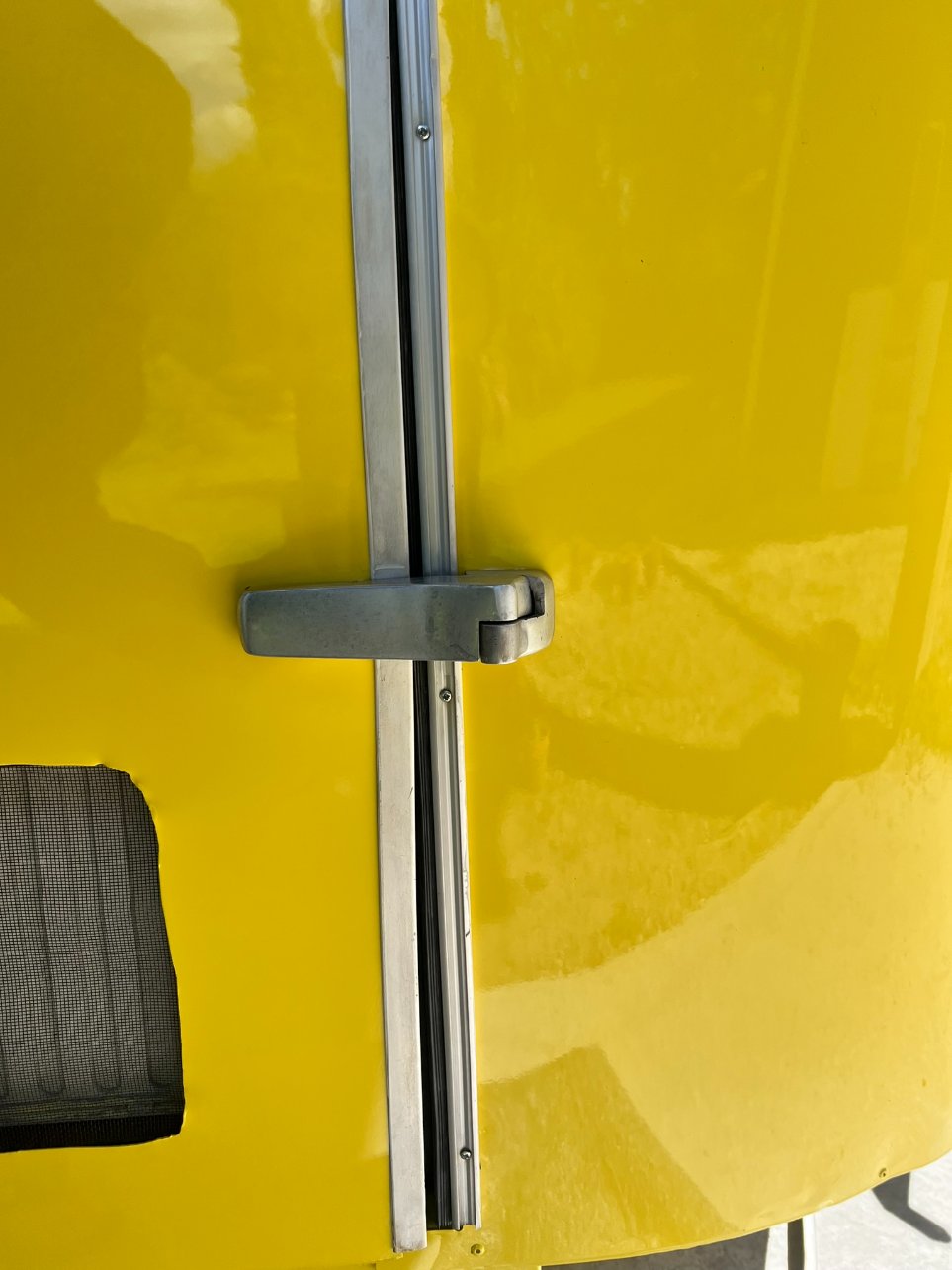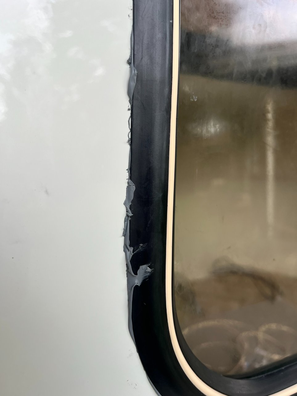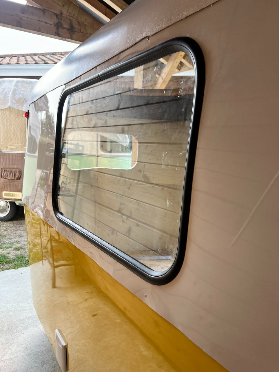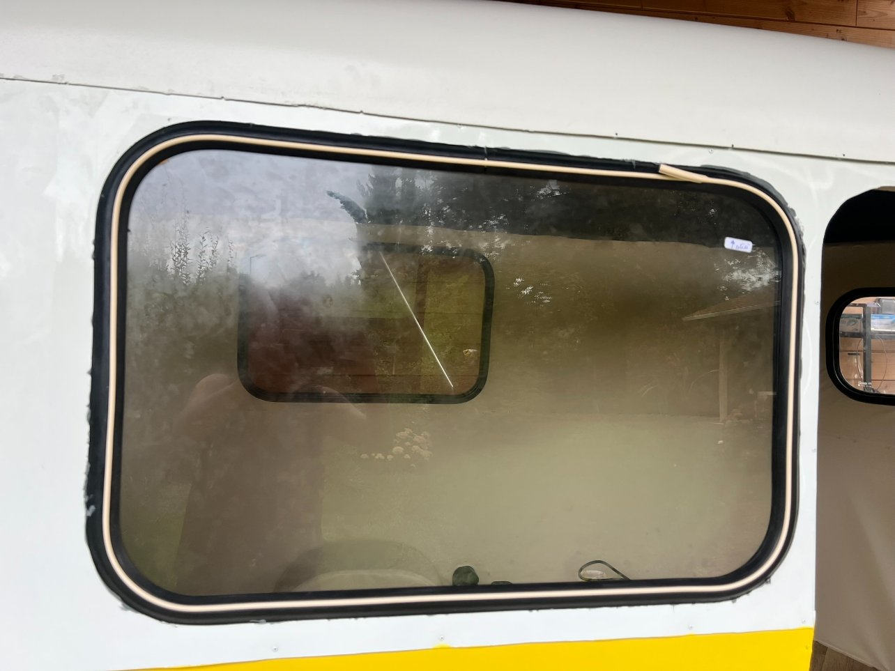 Bon après, il y a eu le petit pétage de plomb avec le butyl, je vais pas revenir dessus, mais il faut mettre pas mal de matière sous le joint et contre la carrosserie. Comme j'ai un côté cracra et même si je sais que le butyl s'enlève très bien le lendemain, j'ai mis du scotch de masquage autour de la fenêtre pour qu'il n'y en ait pas partout, plus pour me rassurer, il n'a pas servi à grand chose...