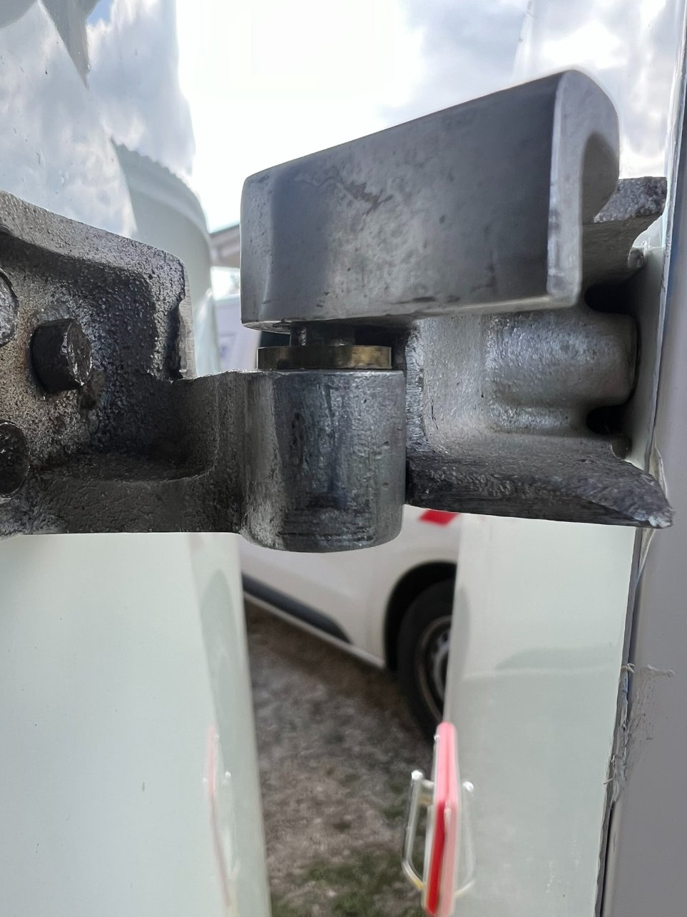 Le léger décalage entre les deux gonds est une technique pour faciliter la mise en place des gonds : on peut enquiller le premier avant d'aligner le second et l'on rattrape le jeux avec une seule rondelle. Je ne sais pas si Eriba utilisait ce système et donc si c'est normal.