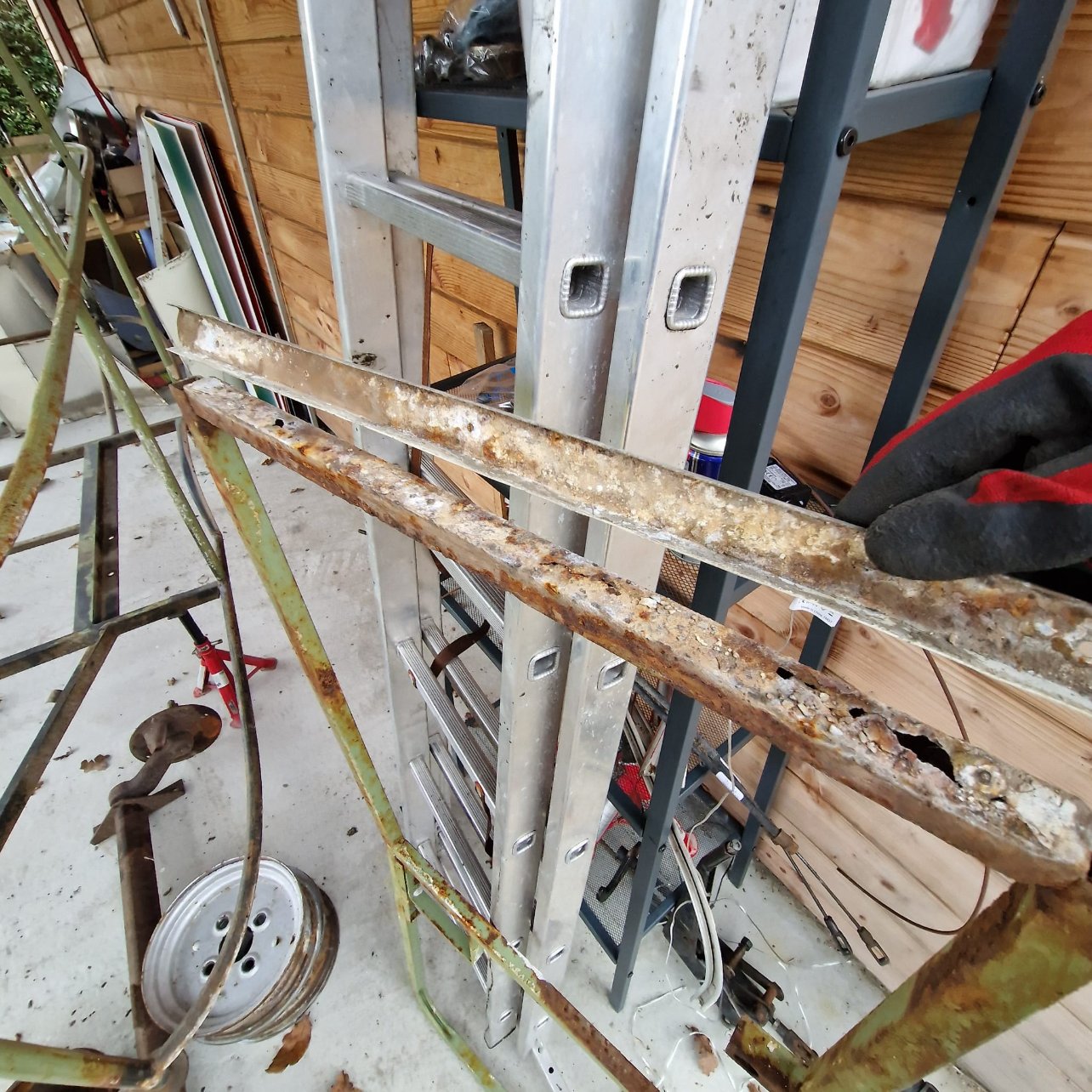 J'ai décollé la tôle alu du bas de la structure de la porte et j'emballe le tout car demain, la porte part chez un nouveau soudeur.