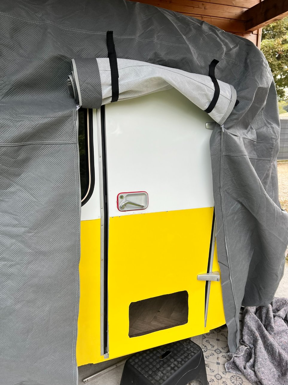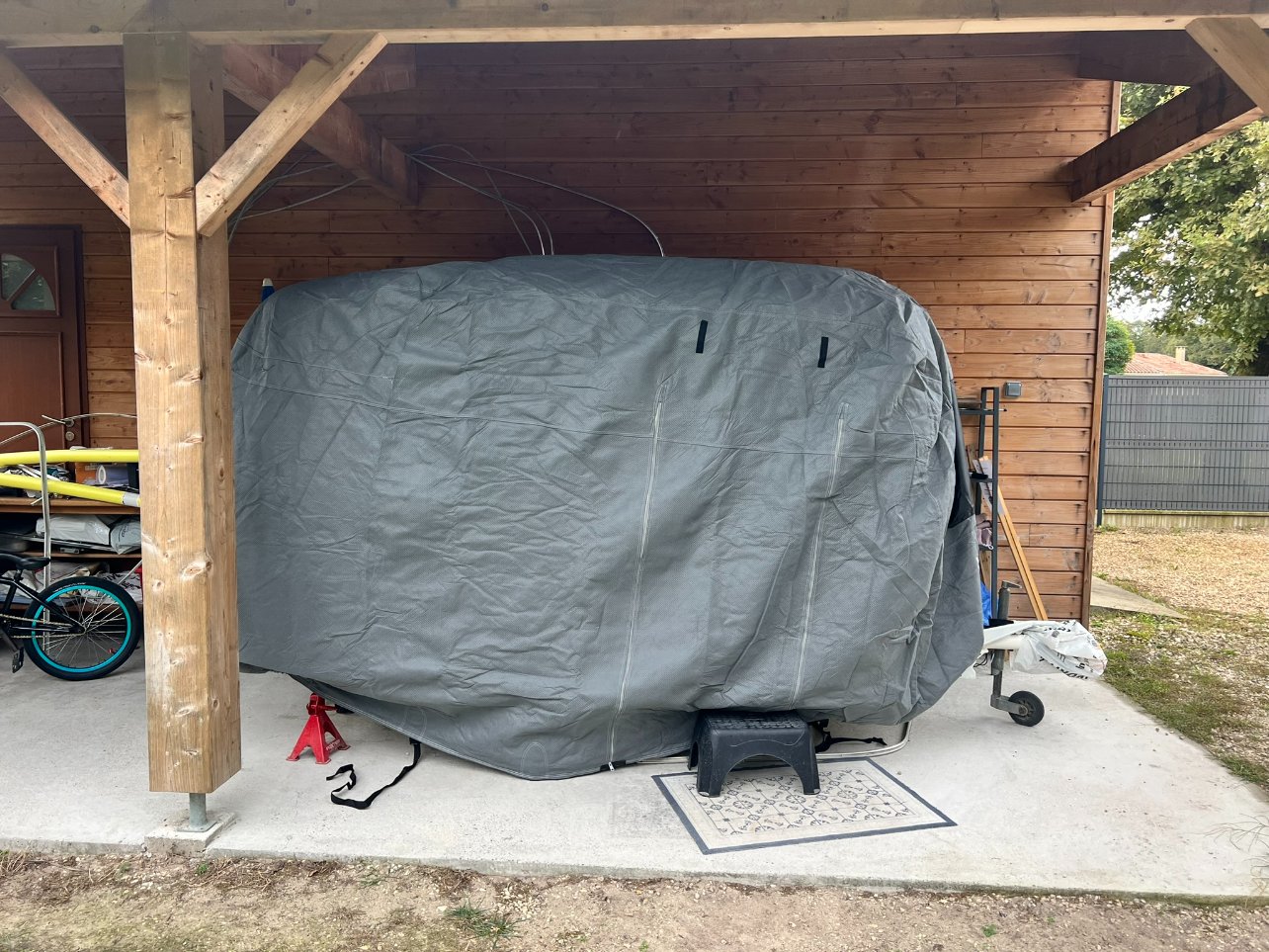 Vendredi vacances, on part un peu et après on se garde une 1/2 journée avec mon grand pour nettoyer le Solex et faire le décompte de ce qu'il faut acheter et je compte bien faire quelques bricoles sur Sunny. Le soudeur a récupéré la porte, il a dit à mon mari qu'il allait faire super gaffe (priez avec moi) et je devrais la récupérer en fin de semaine ! Ce début de semaine j'ai dû ouvrir la porte du sarcophage car il faisait chaud dans Sunny (dimanche il faisait 26°C), c'est presque un concept de sauna en caravane cette histoire, pour l'hiver ça va aller mais si on laisse cette housse l'été faut absolument lever le toit et ventiler !