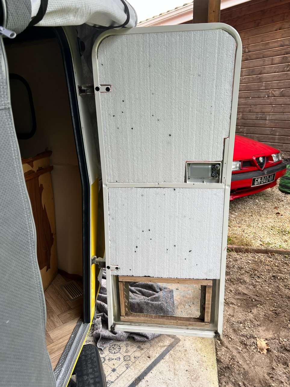 Direct je file sur Sunny pour tester la tenue des charnières et bien sûr le passage de la porte (je n'ai pas remis l'encadrement et l'intérieur au cas où ça foire)