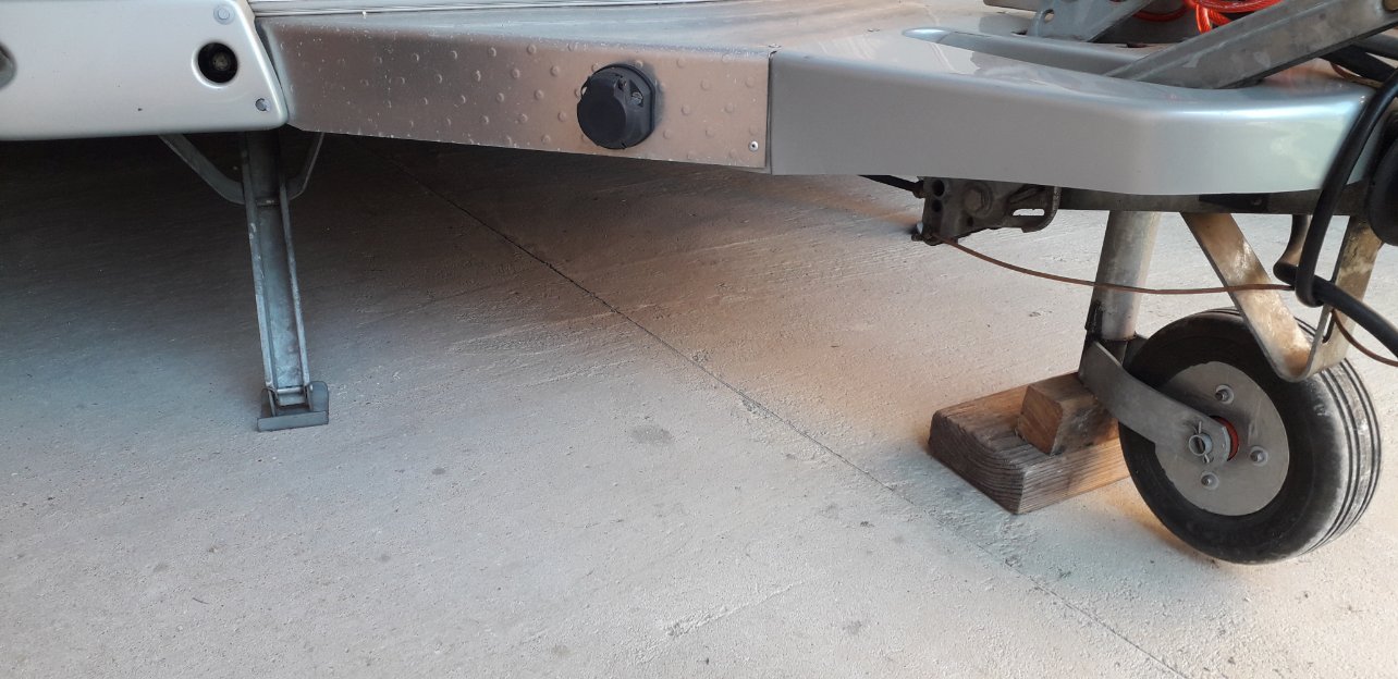 Sur chandelles, stabilisateurs abaissés, roue jockey hors sol, posée sur l'axe, frein à main abaissé.