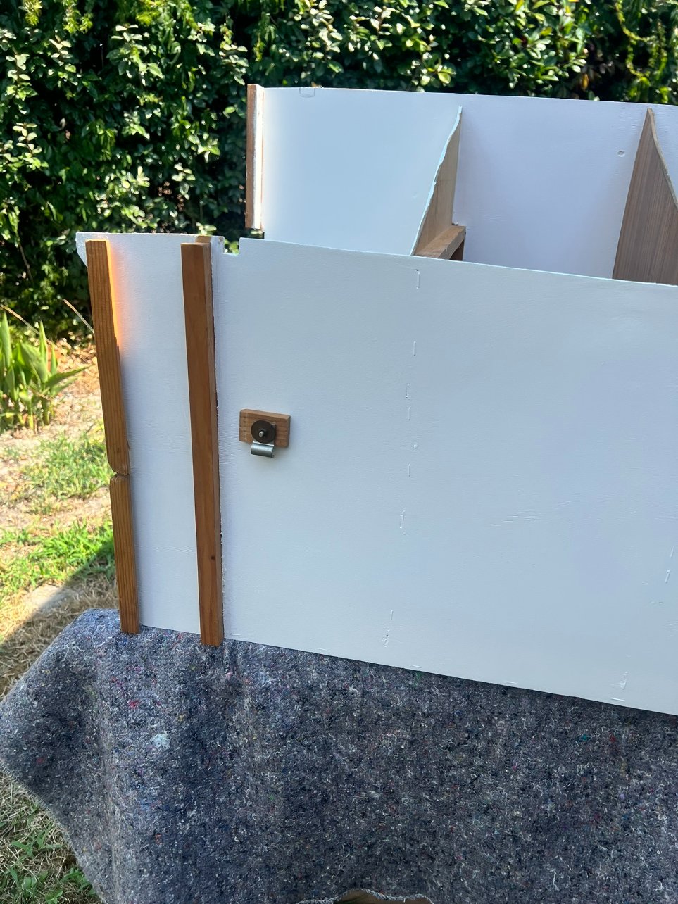 Bref, il faut que ça rentre dedans mais mon bois s'est un peu déformé depuis le temps, donc je décide d'y coller un tasseau et ensuite de rajouter des équerres. L'ajout de ce tasseau devrait aussi me permettre de rajouter des étagères plus tard...