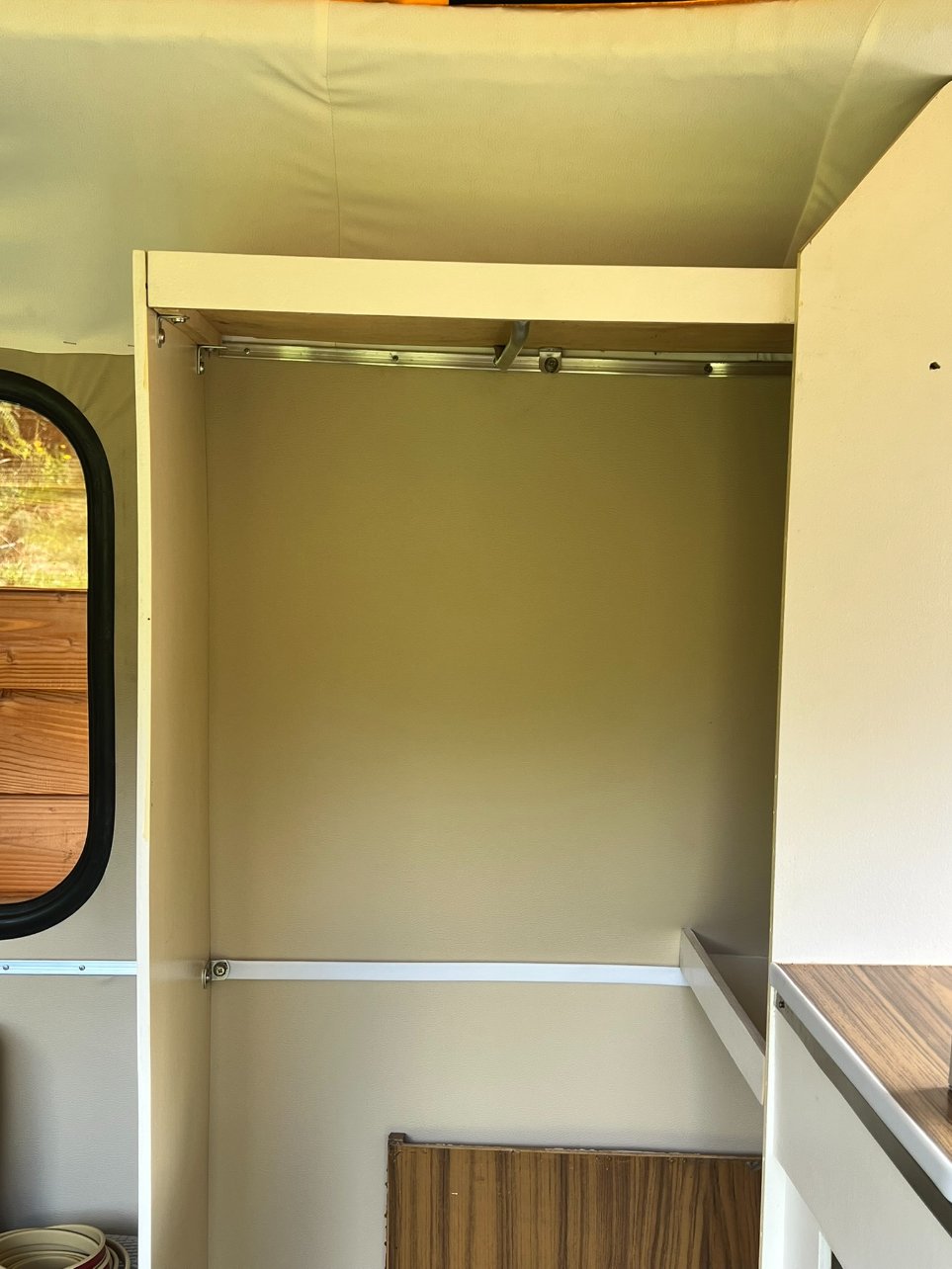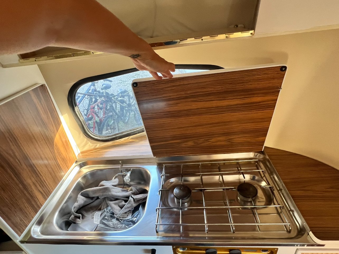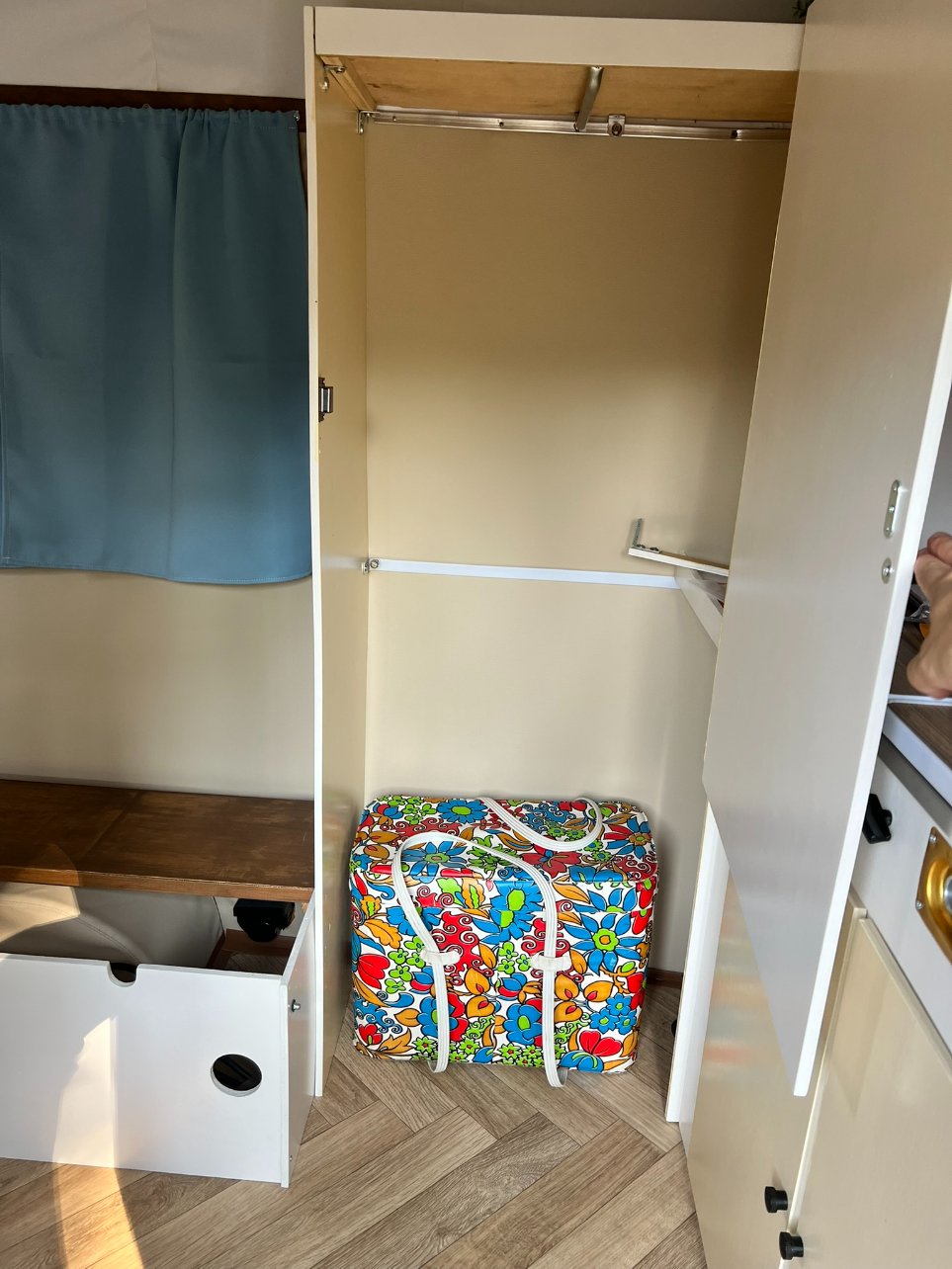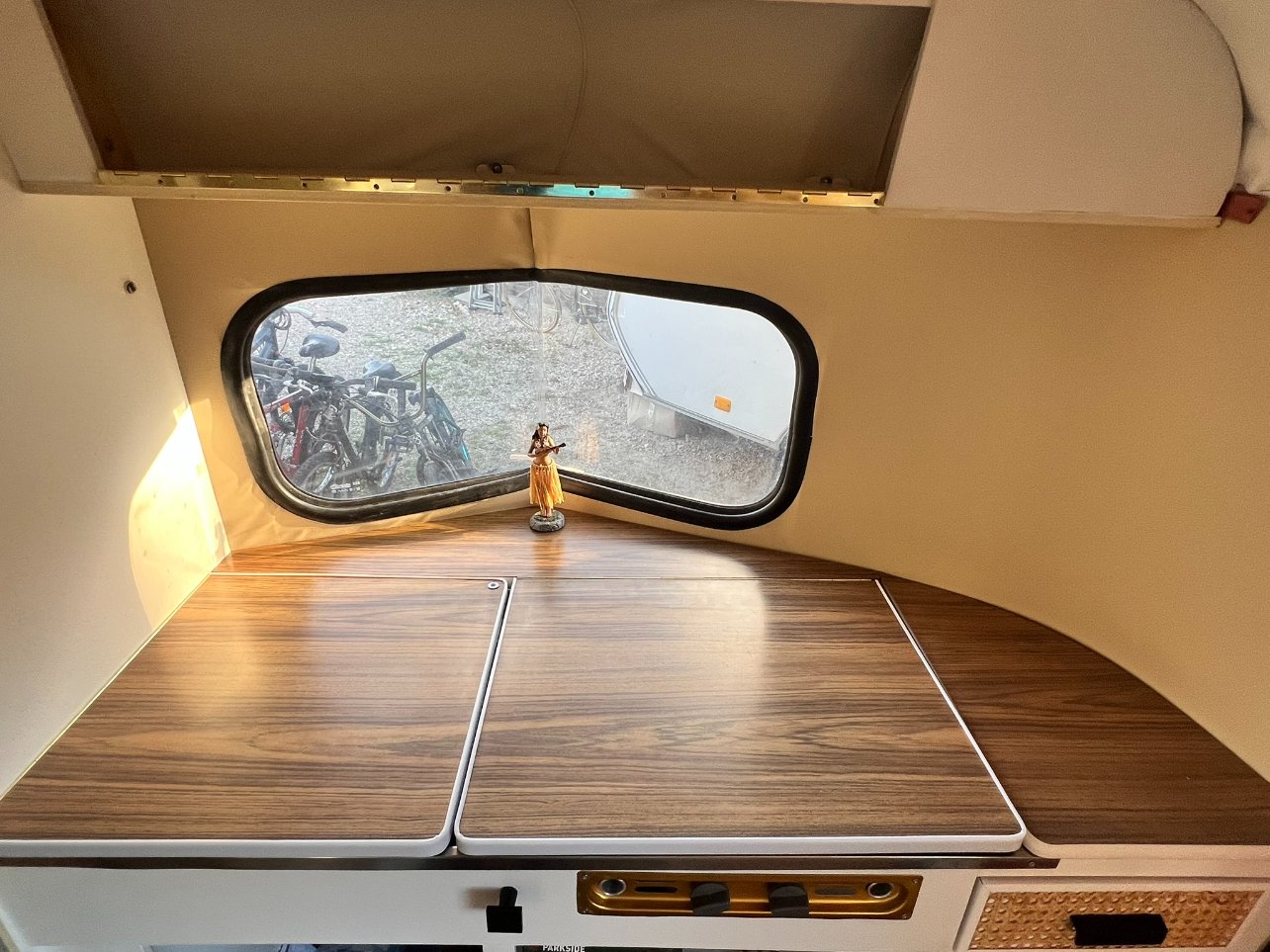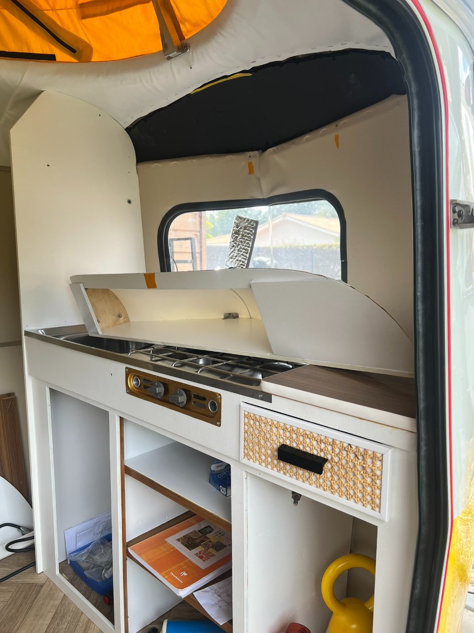 A l'intérieur je n'ai pu sauver que les assises (et la table + tablette qui iront dans Sunny), j'ai donc jeté la penderie et la cuisine trop abimées (sauf l'évier/gaz qui est nickel), les accessoires et rails métalliques sont manquants mais on peut faire sans.