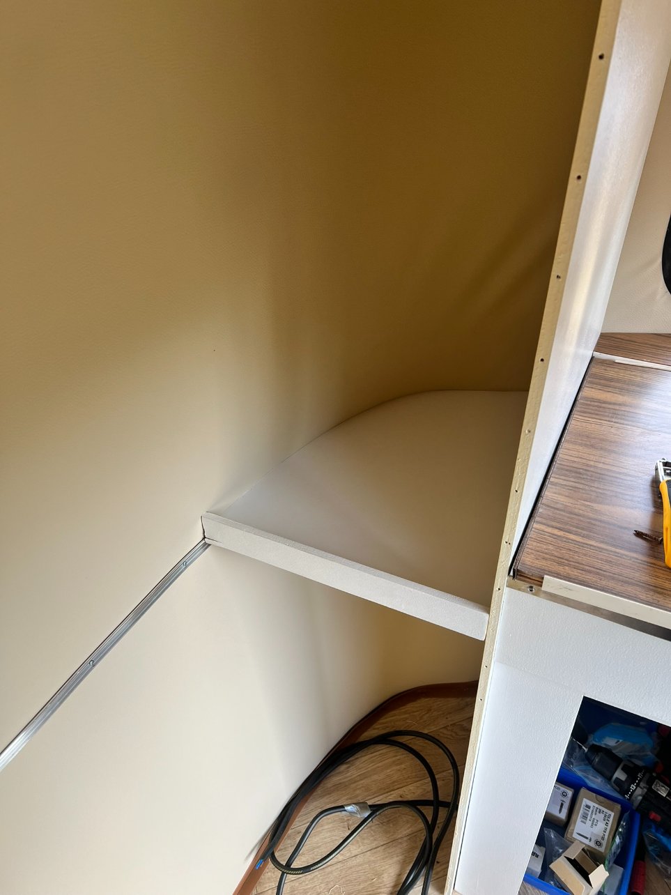 J'ai donc commandé à l'autre bout de la planète un rail qui se "clipse" mais comme il me restait un bout de "qui se colle" de la cuisine, j'ai mis cette chute dans le placard, tenu d'un côté par la vis de l'équerre et de l'autre par l'étagère, nickel! (ça ne suffira pas pour mettre derrière les assises avec les frottements mais le visuel est parfait):