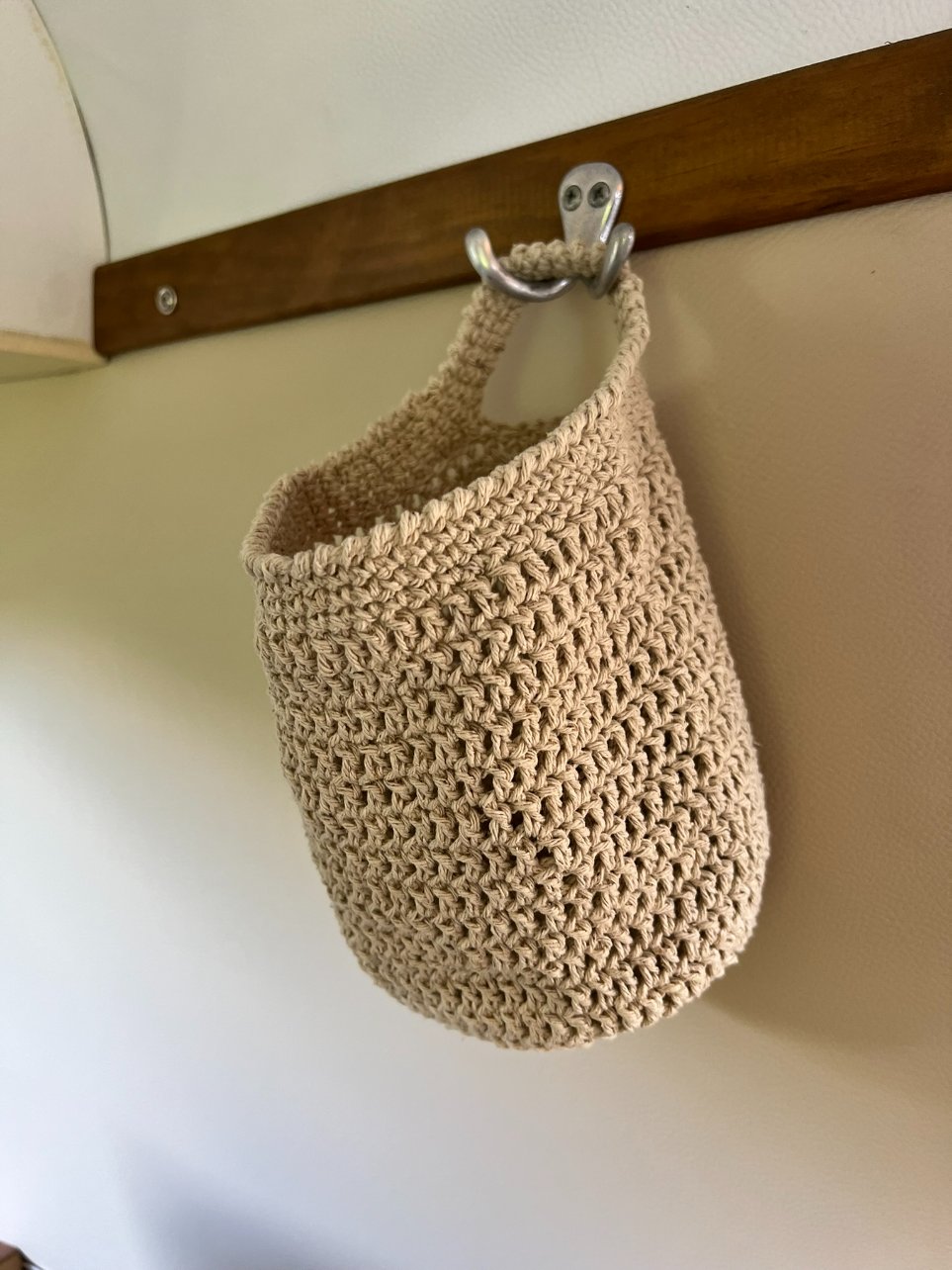En haut de Sunny il y avait 2 bandes de CP recouvertes de Vénilia qui servait à camoufler la vilaine jonction toit/mur. J'en avais un correct et l'autre pourri car a pris l'eau. Je refais donc ces bandes avec des chants plats en les lasurant en foncé (teinte noyer) et vernis, je trouve que c'est plutôt ressemblant: Et puis je ne peux m'empêcher de mettre les supports rideaux... porte manteau... et du coup je teste les petites panières que ma mère m'a fait en macramé