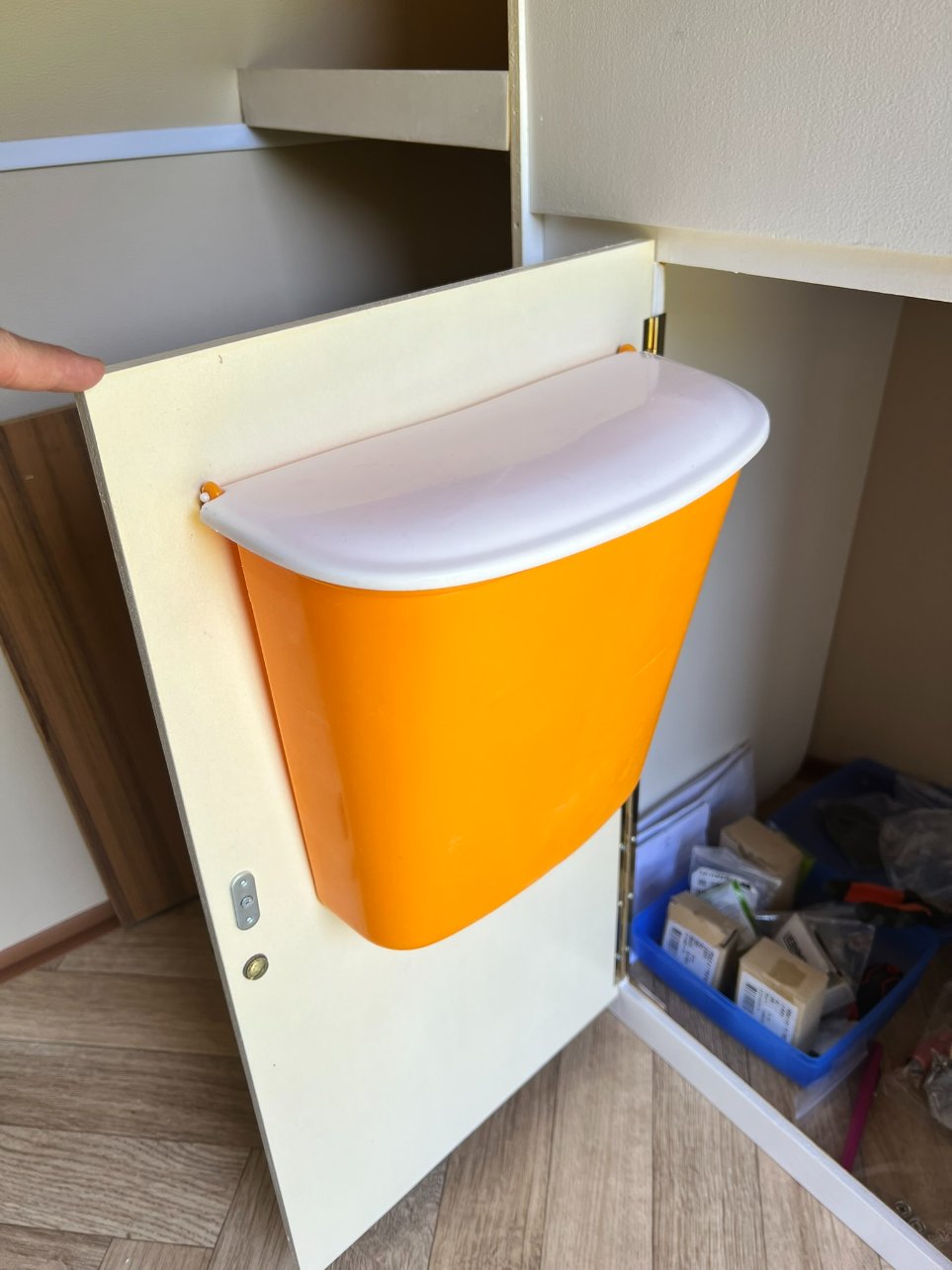 Et forcement, quand tu as une porte posée, tu peux pas t'empêcher de mettre ce symbole de l'ERIBA 70's, j'ai nommé "LA POUBELLE ORANGE"!!! Dans le placard du gaz pour le moment il y a cette petite chose, trouvée chez Ikea, c'est un genre de jerican.