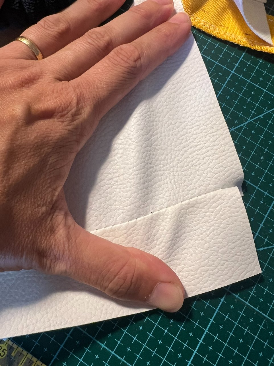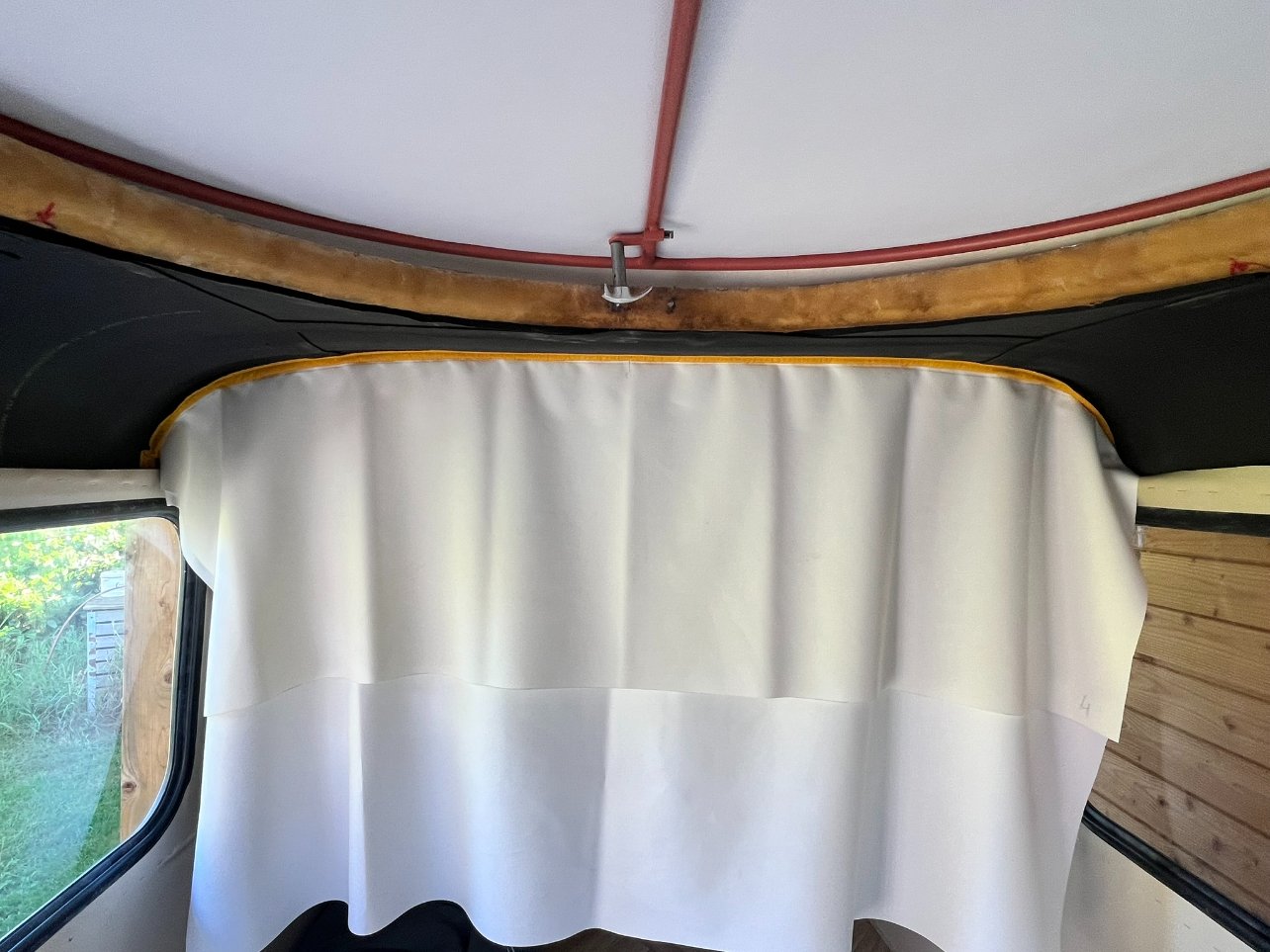 Je positionne l'Armaflex (10mm) que j'avais coupé pour vérifier qu'il soit bien à l'intérieur du support. Cet isolant est autocollant et sa colle est monstrueuse, pas le droit à l'erreur mais surtout pas besoin d'en rajouter! Me voilà donc avec un toit bien isolé thermiquement mais aussi phoniquement. Je déroule ensuite le simili cuir sur le toit et coupe en rajoutant une petite marge supplémentaire et en me servant toujours du support pour le maintien et m'assurer de la bonne largeur. Ensuite, avec un stylo effaçable (pour la couture j'utilise les stylos fixion qui s'effacent avec la chaleur, sur le simili ils s'effacent avec un chiffon humide... le doigt baveux marche aussi
