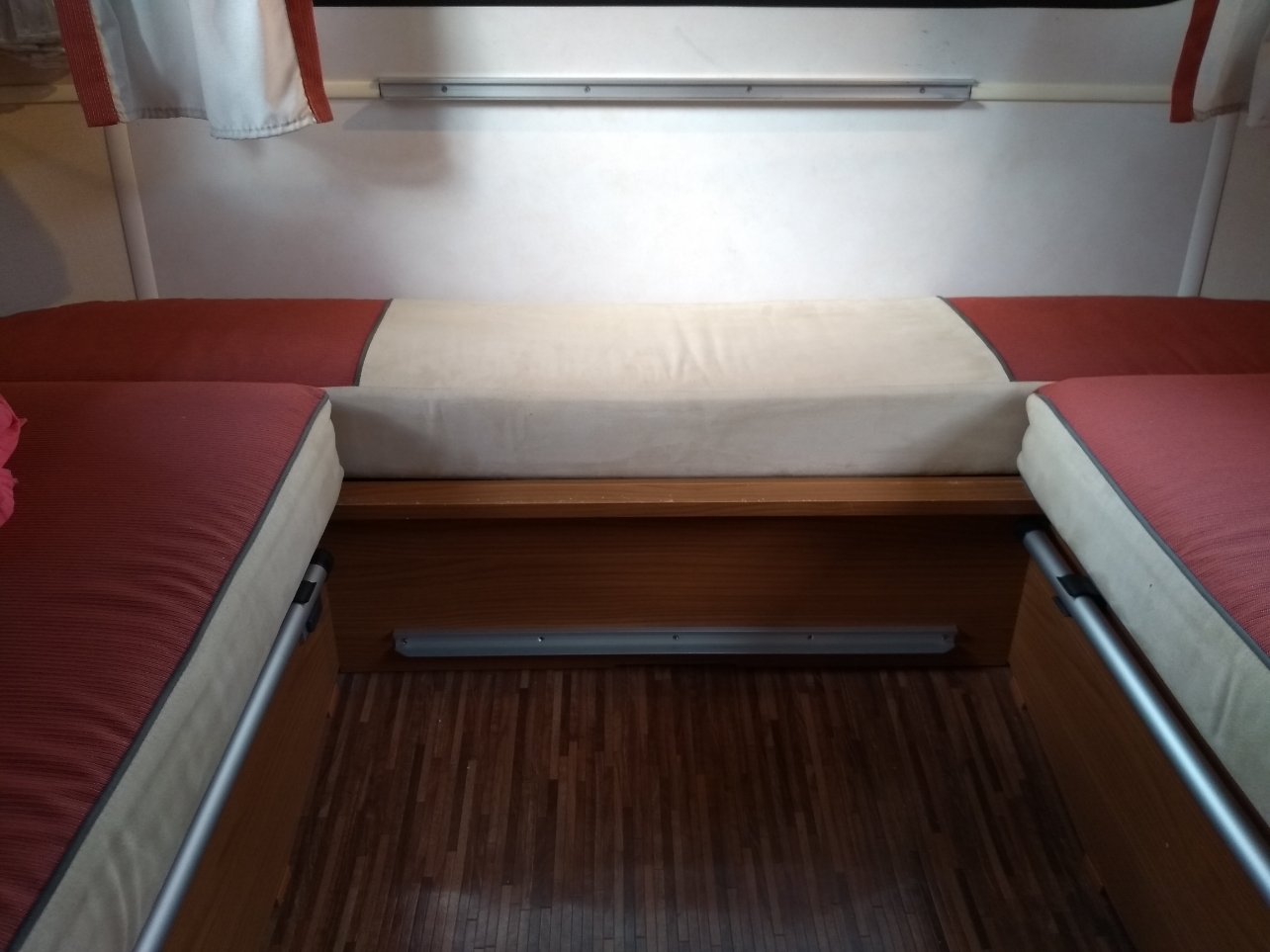 Perso je mets la table dans le rail extérieur le temps de notre séjour, puisque lit permanent, et pour la route posée sur le lit accrochée à son rail.